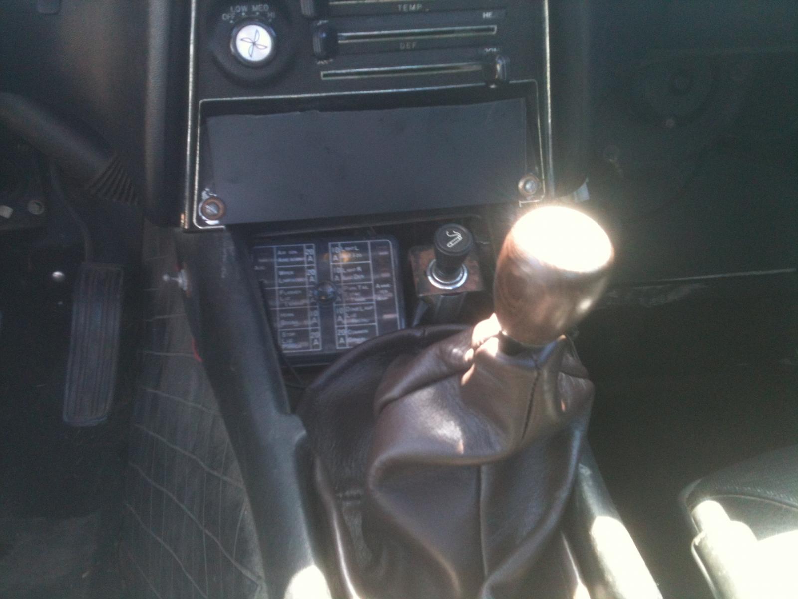 Started working on her a bit today. First thing I did was work on the interior a bit. I slipped on a spare leather shift boot I had laying around, and fabricated a cover for the stereo slot to cover up those nasty wires.