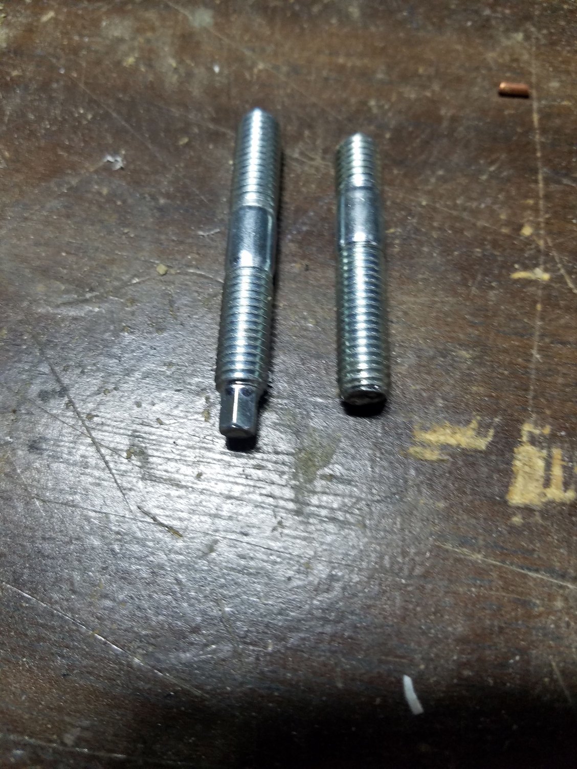 Side by Side comparison. Napa stud on the left, stock Nissan stud on the right. The extra length on the "short" threaded side will help retain the stud. They fit without modification.