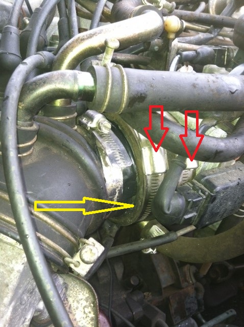 I'm seeing lots of clamps where there should only be one... It looks like there's still a boot on the throttle body (see my red arrows). Remove the boot at the yellow arrow.