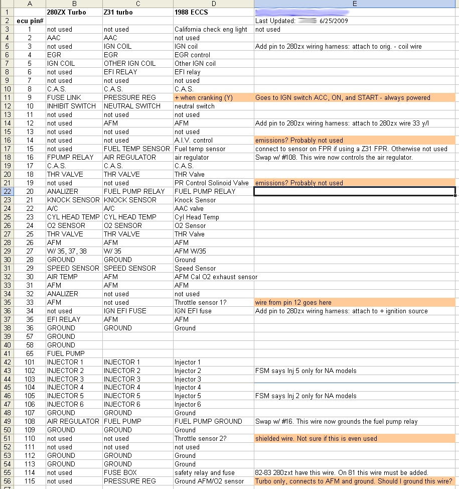 Last summer NismoPick sent me his spreadsheet on the 1984/85 Z31 ecu wiring he had come up with. I went through the 1988 300ZX factory service manual and made my own notes and compared it to the earlier version.