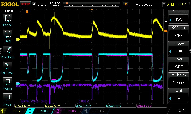I've attached the results of my first attempt at room temperature (2KOhm temp sensor resistance). The top yellow signal is the MAF raw output, the blue is the VAF raw output, the pink is the converted MAF output, and the bottom purple is the difference between the converted signal and the original VAF signal. The MAF curve changes with temperature, so that's most likely why it didn't work when I loaded it into the car.