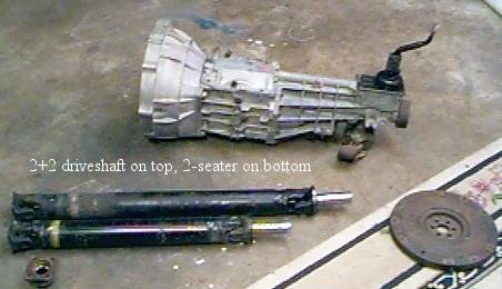 Install 5-speed transmission with driveline. I've heard from some that the Nissan driveshaft for both matches; other sources say they don't. For me in the truck the auto driveshaft did not work. I got the driveshaft from a truck with a manual transmission. Keep in mind if your car is a 2-seater, you must use a transmission from a 2-seater. 2+2 must use same. If you swap in a T5 (turbo) then you need the same body length driveshaft from a TURBO car. Also, on a T5, the back end of the driveline is different. Unbolt the differential front driveline flange from the turbo car. This flange will work on both a 2-seat or 2+2 car since it is just a flange that the driveline bolts up to.