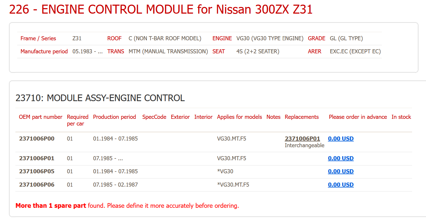 Does anyone have any experience of changing ECUs? My old one on my Z31 seems to have suffered from a rain leak and will deliver neither fuel nor spark to the engine. ( It only cranks over). I have seen a number of alternative replacements from other Z31s of the same, or adjacent year. Like mine they are non turbo and manual transmission. They are mainly from the USA and I am in the UK where mine was first registered. None have exactly the same part number. The nearest has 9 of the 10 digits the same. Only the final digit is different. Does anyone have thoughts or opinions on whether this or ones similar are likely to work? (at least to start the engine and make the car mobile). Thoughts,opinios, experience - welcome