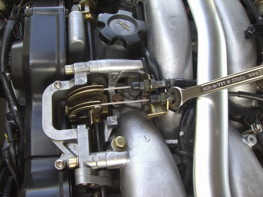 i have a 94 convertible automatic NA 103k mi.. running down the center of the engine theres two throttle cables that "T" at a rotating bar that runs to the air intakes.. the gas pedal was very stiff to press so I cleaned the cables, springs, and bar... while doing so i noticed that one (passenger side) cable doesnt move.. when the pedal is pressed the drivers side cable moves freely and while its pressed the pass. side cable can be moved by hand but does nothing on its own... in the pic the lower cable moves freely with the pedal.. the upper does nothing