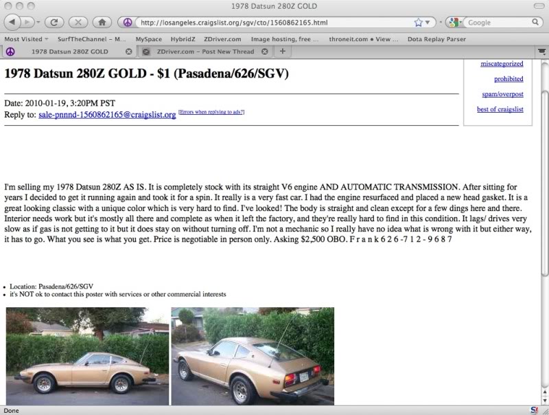 http://slo.craigslist.org/cto/1543153301.html "This is becoming a rare bird indeed. It is a 1988 Toyota Supra with the factory turbocharger. Not too many of these still on the road because the kids keep redlining them and blowing the engines. This one has a rebuilt engine with low miles. Will listen to reasonable offers after inspection. For further info contact : will{at}bidslo.com or visit our page at www.bidslo.com" https://images.craigslist.org/3n43mf...68420f11c7.jpg |